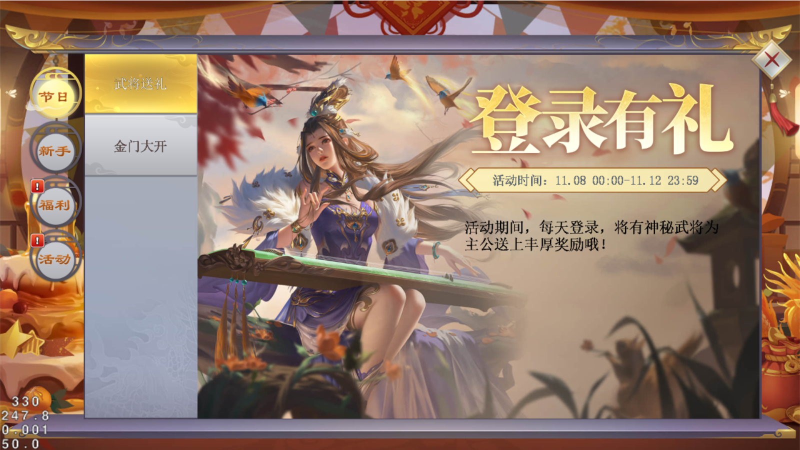 活动期间每天登录游戏即有武将送上好礼一份~