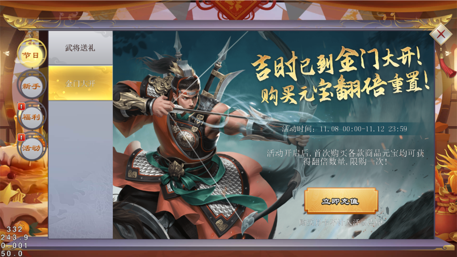 活动开启后,首次购买各档位元宝均可获得翻倍数量,仅限一次。