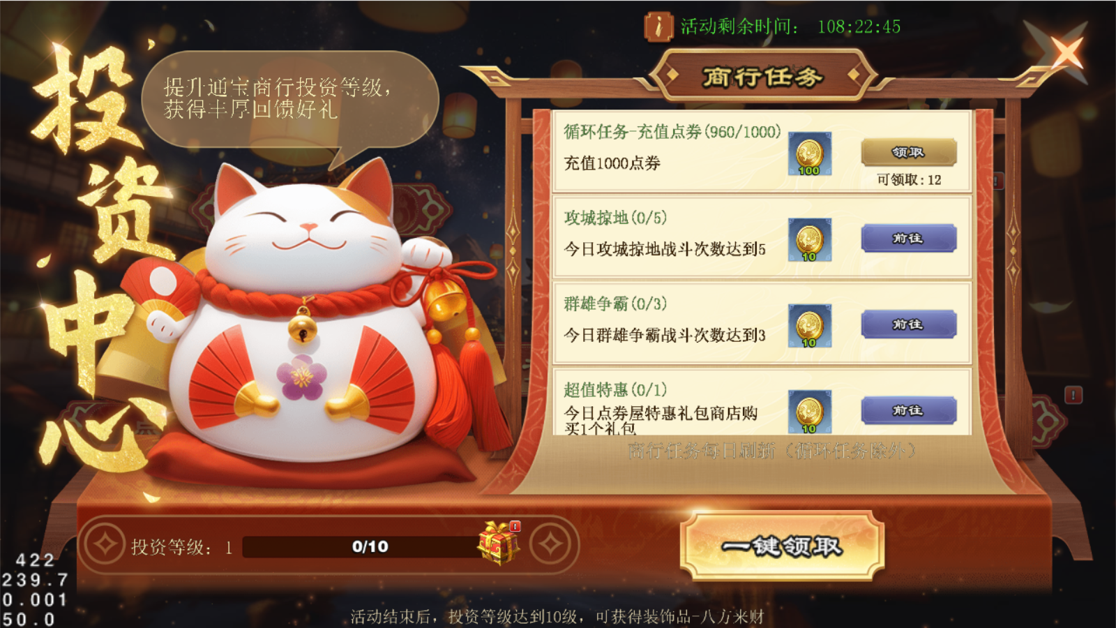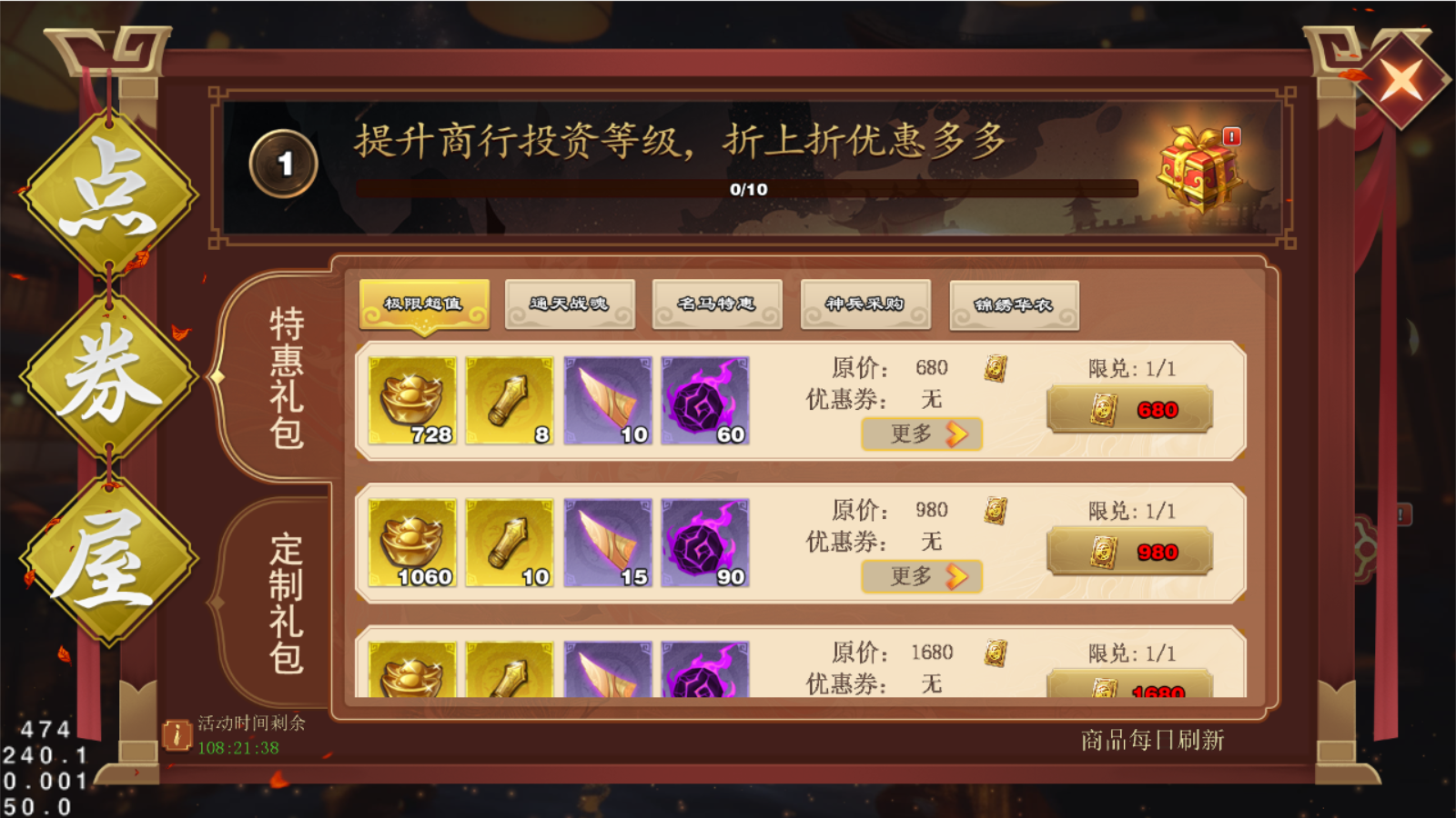 完成任务,提升投资等级,从而拿到更多<点券折扣券>和<元宝折扣券>!