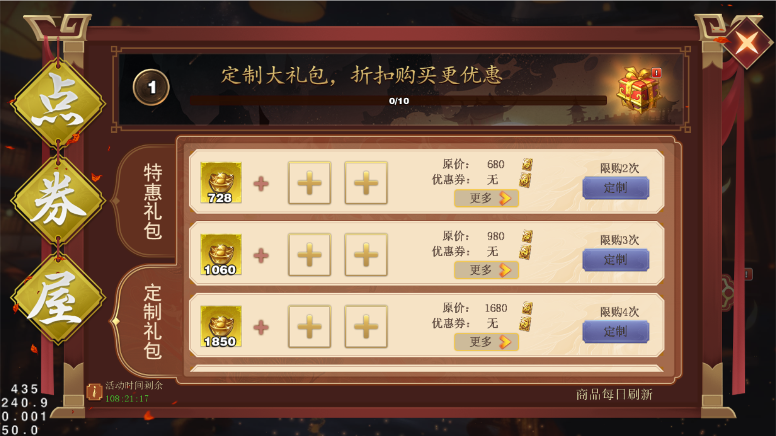 在<定制礼包>当中,主公则可以自行选择需要的资源道具,使用点券优惠券后,同样是更优惠的折扣价格哦~