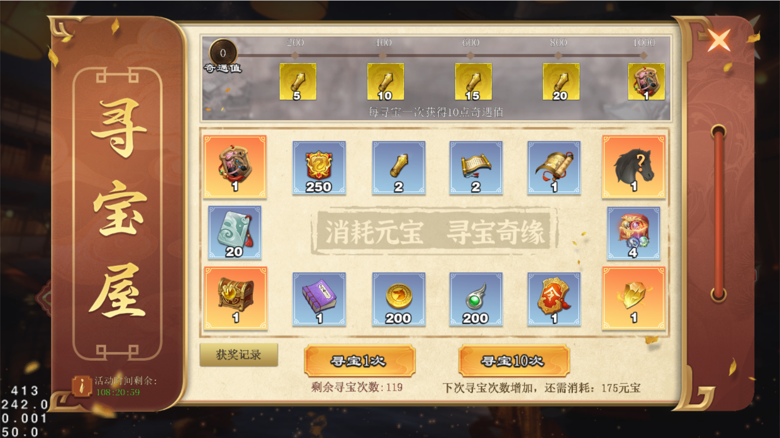 活动期间主公每消耗200元宝即可获得1次寻宝次数,寻宝就有机会获得各种奖励,每次寻宝还能累计奇遇值,只要累计一定奇遇值即可直接获得丰厚吉签,还有终极大奖直接获取!