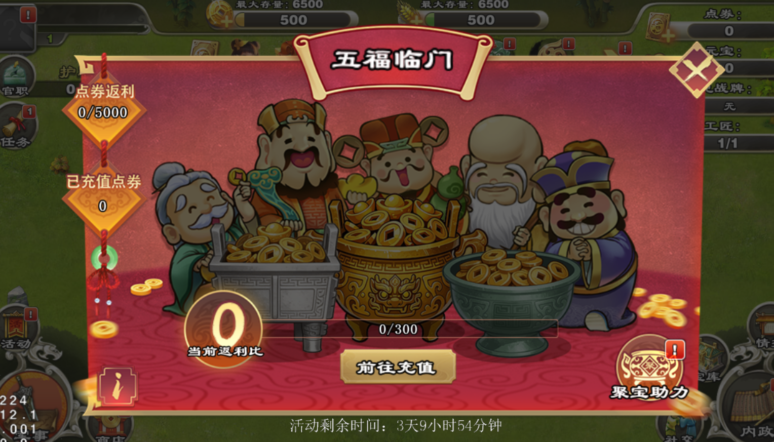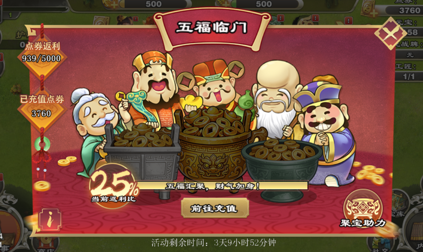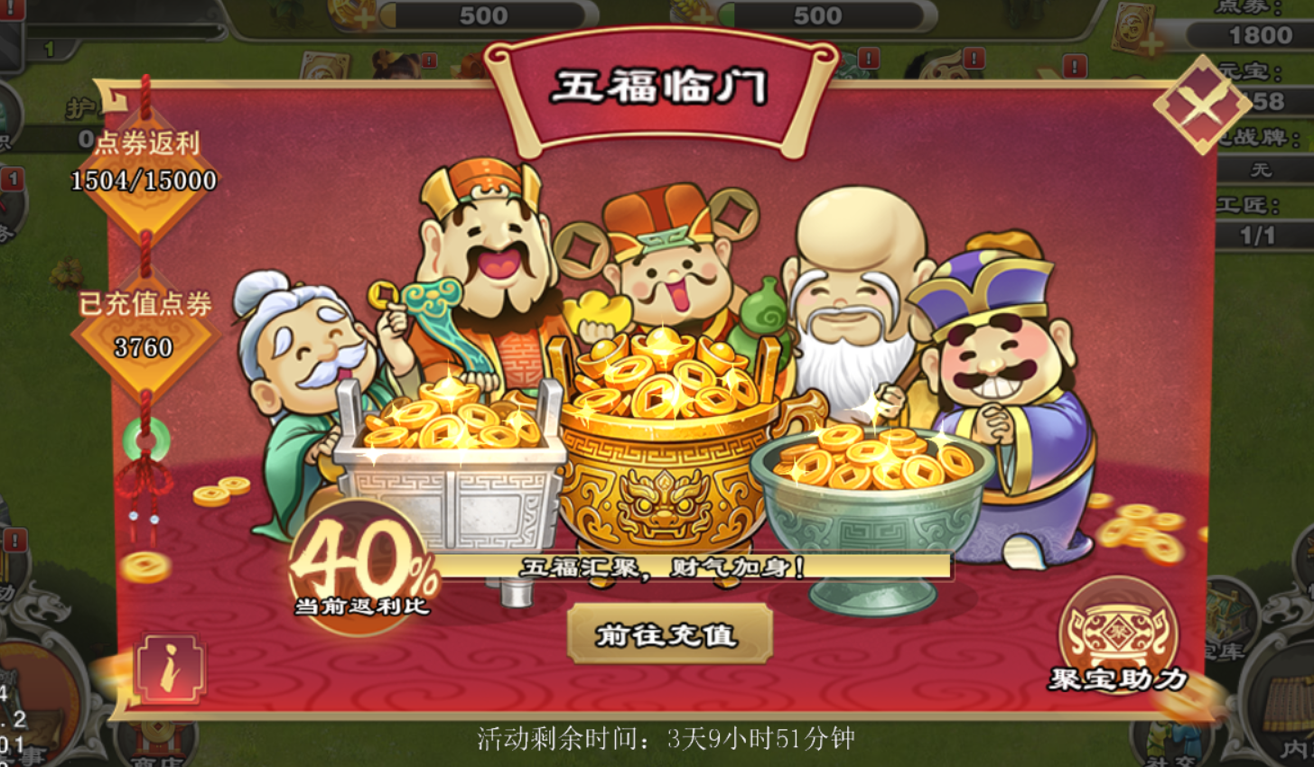 活动期间,主公充值一定数量的点券,可依次恭迎“福、禄、寿、喜、财”,每恭迎一位可提升5%的返利比。