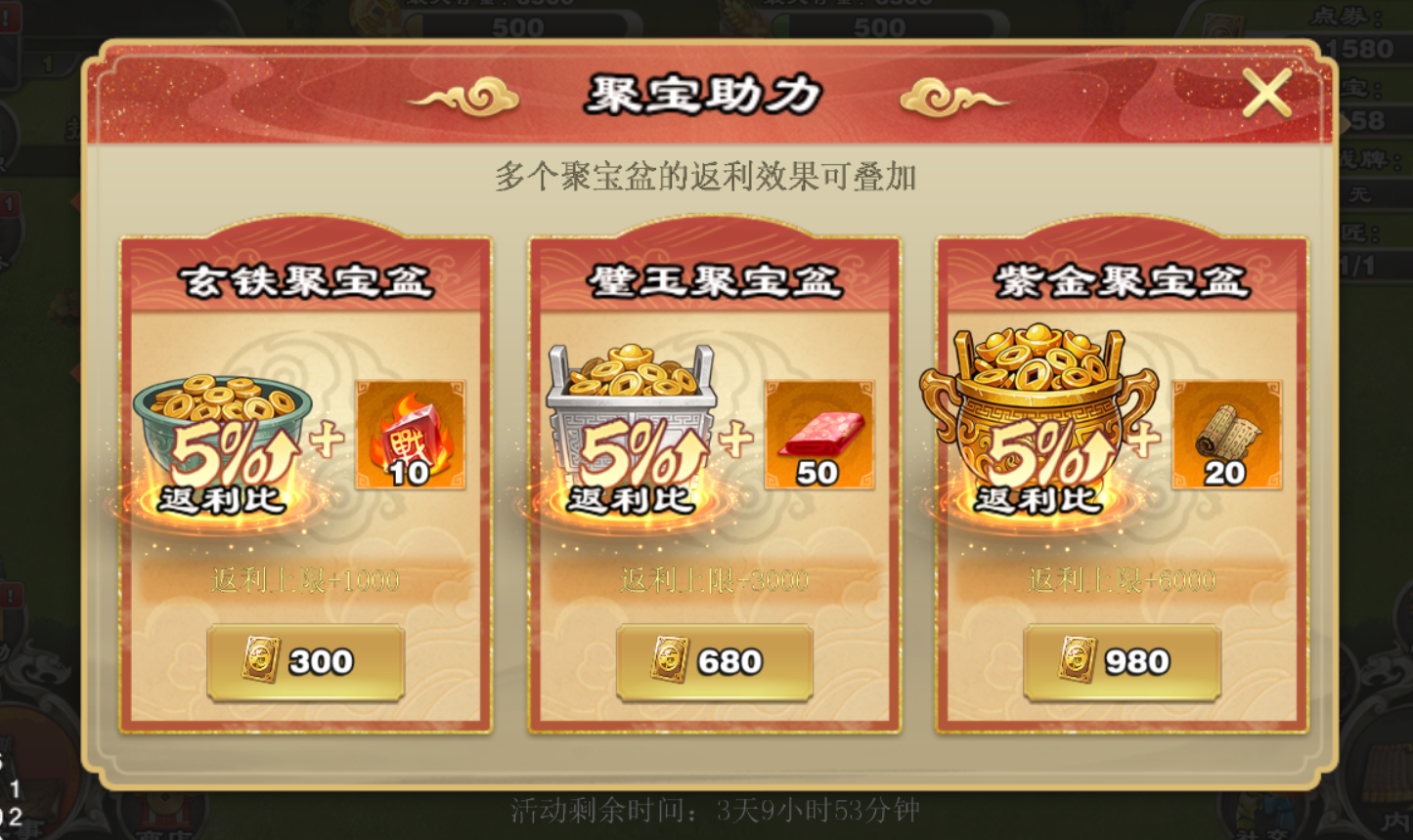 此外,主公还可以在<聚宝助力>中,使用点券购买聚宝盆,聚宝盆包含道具奖励,还可以提升返利比和返利上限。